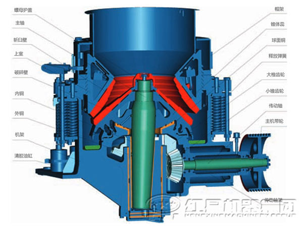 標(biāo)準(zhǔn)型、中間型、短頭型圓錐破碎機(jī)的基本結(jié)構(gòu)主要有機(jī)架、水平軸、動(dòng)錐體、平衡輪、偏心套、上破碎壁(固定錐)、下破碎壁(動(dòng)錐)、液力偶合器、潤(rùn)滑系統(tǒng)、液壓系統(tǒng)。